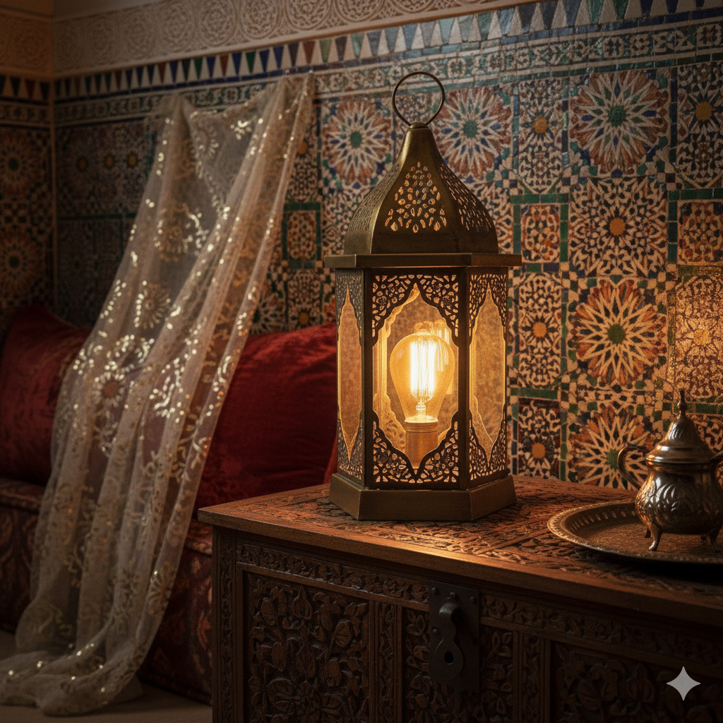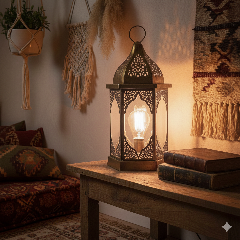 Decorative Lantern Brass creates warm vintage ambiance. Perfect for eclectic and boho interior themes.