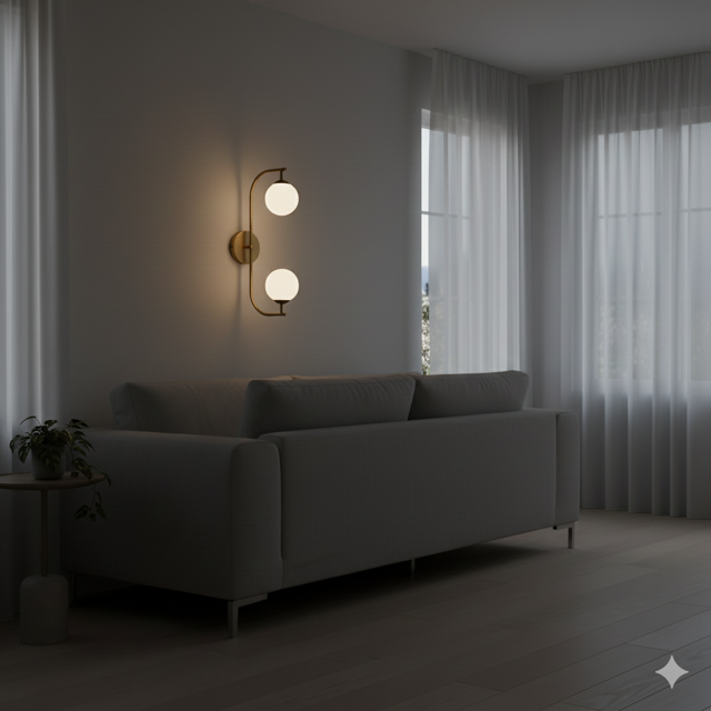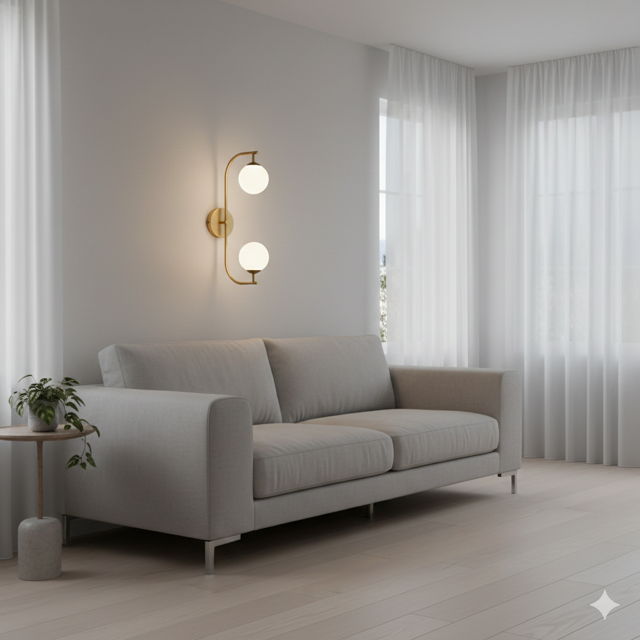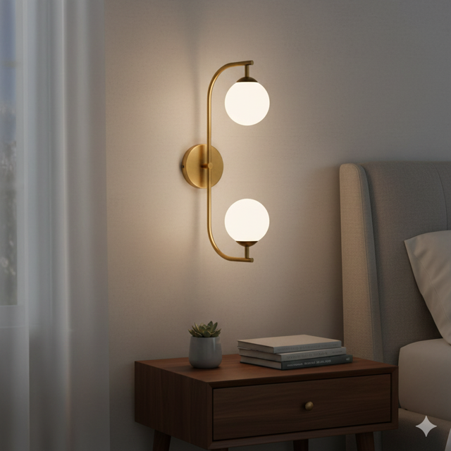 Elegant Wall Sconce features minimalist curved brass arms with frosted glass. Perfect for bedroom walls and corridor lighting.