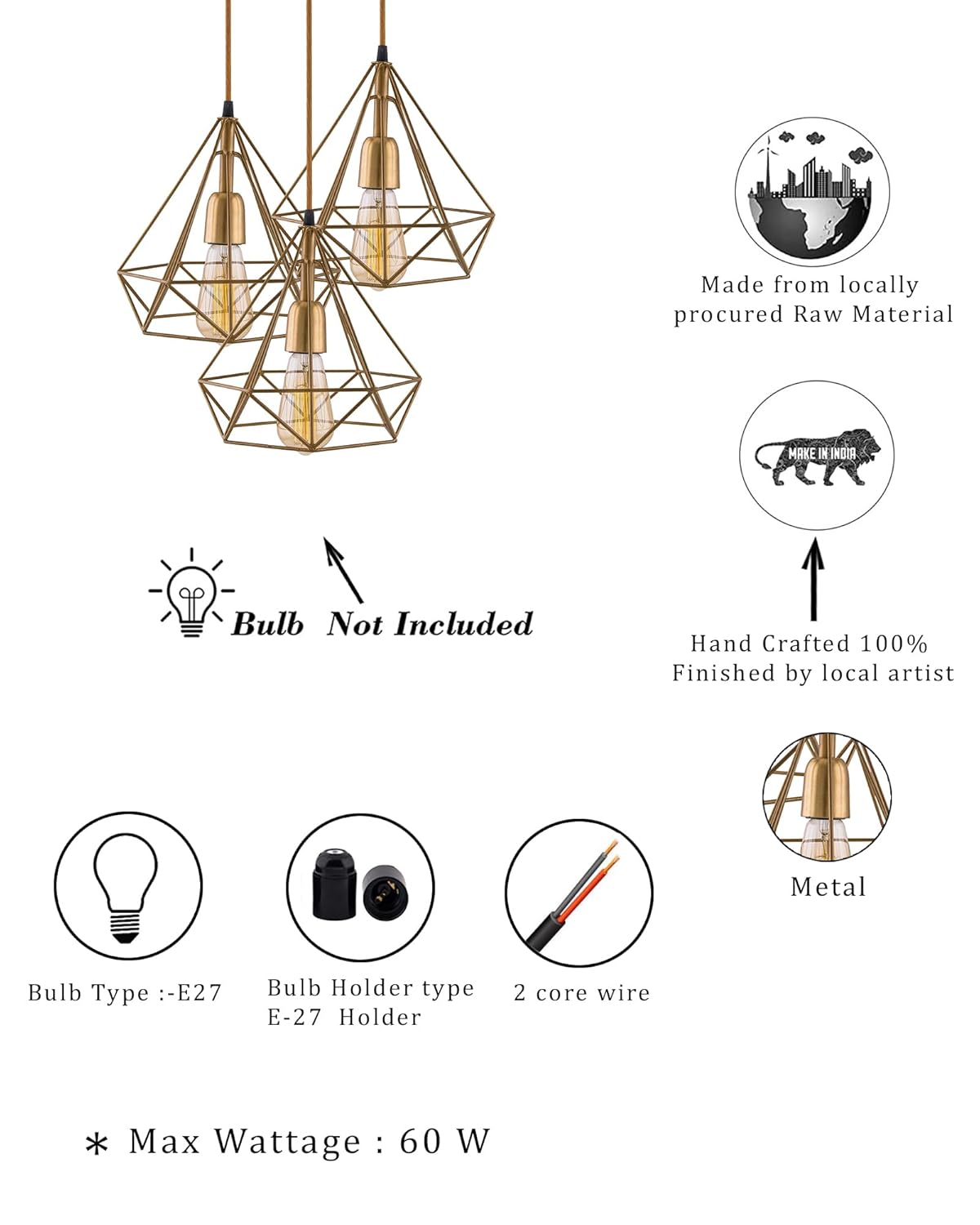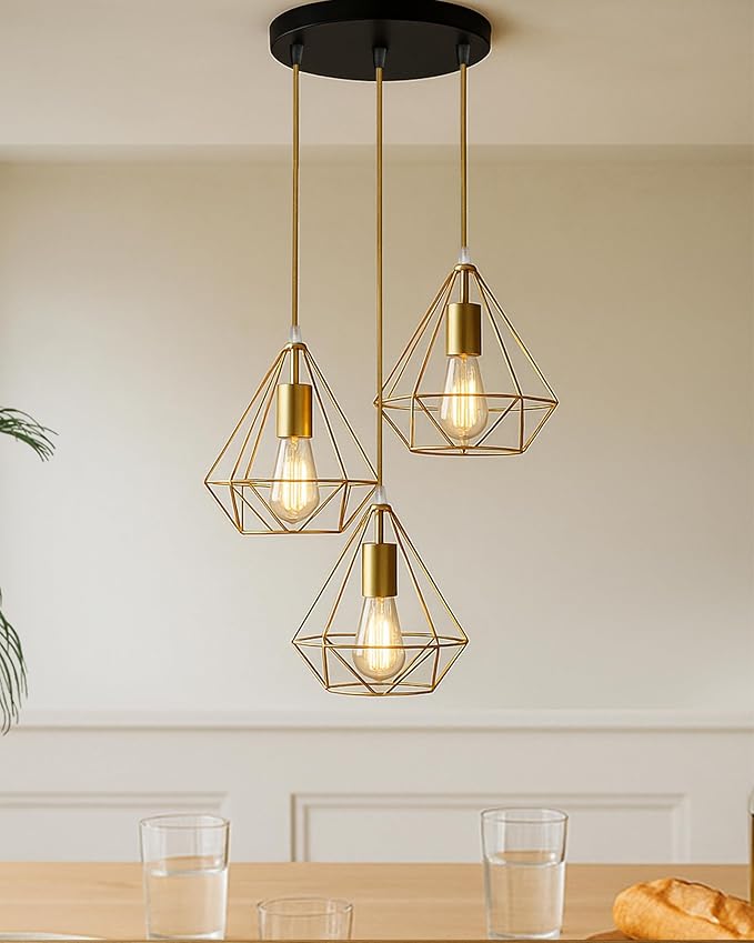 Geometric Cage features open angular framework in warm gold. Creates interesting shadow patterns while maintaining ambient lighting.